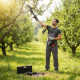 Тук всичко е направено да е удобно и контролируемо. Тялото на триона е компактно и балансирано за работа с една ръка, което е важно, когато си на височина или държиш пръта в стабилна позиция. Дръжката е ергономична и противоплъзгаща, така че не се бориш с инструмента, а работиш с него. Има защитен капак на веригата, който пази и теб, и механизма при работа близо до клони. В комплекта има кутия за носене, така че не хвърляш всичко в багажника – поддържаш ред, не губиш части и инструментът е винаги готов.