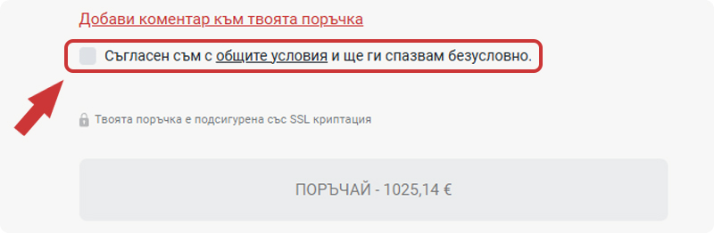 Нужно е да проверите дали сте се съгласили с Общите условия, чрез поставяне на отметка: