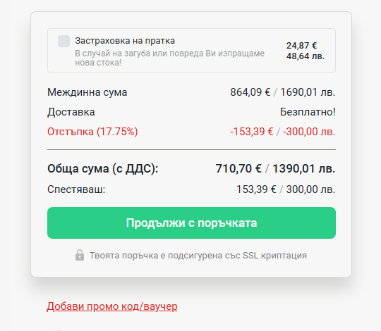 6. Промо кодът активира автоматично отстъпката и тя се калкулира от крайната цена.