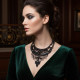 Дизайнът е драматичен и изразителен, вдъхновен от комбинацията на класически кристални форми и съвременни метални плетива. Огърлицата привлича внимание с каскадните редове от кристали, които се спускат в хармонична симетрия, и с декоративните висящи елементи, които придават движение. Черната метална основа контрастира със светлите камъни, създавайки модерен и почти театрален ефект — перфектен за жени, които искат да изпъкнат с уверен стил. Това е бижу, което допълва както вечерен корсет, така и по-сдържан кежуал ансамбъл, придавайки финален щрих на всяка визия.