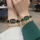 Часовникът има елегантен правоъгълен корпус със скосени (октавни) ръбове, златисто покритие и минималистичен циферблат с четири блестящи индекса. Логото върху циферблата (Paidun / Reilun) е дискретно, а надписът „Quartz“ подсказва характера на механизма. Верижката е декорирана с големи фасетирани правоъгълни елементи в съответния цвят (зелено или черно), които играят със светлината и придават бижутерийно усещане. Съпътстващата гривна е ритмична поредица от сърцевидни елементи, плътно покрити с кристали – женствен детайл, който допълва корпуса и верижката на часовника. В комплекта всичко е в един визуален тон – златист метал + цвят на камъните – за чист, луксозен силует на китката.