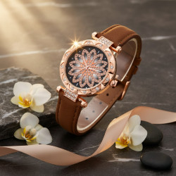 Циферблата е стилно черен а цифрите 12 и 6 са изписани с римски числа, останалите часове са само отбелязани с чертички в златист цвят. Без гривните, които са подарък към комплекта, часовникът е в офис стил, удобен за срещи и бизнес начинания. Поставяйки четирите гривни, вашият часовник се превръща в парти аксесоар, подходящ за всякакъв повод. Гривната е изключително удобна, достатъчно широка и дълга за всякаква китка. Изработена е от кожа, с удобно класическо закопчаване. Две от гривните – подарък са с елегантна кожена верижка, стилен мраморен камък с обков и златиста закопчалка. Третата гривна е в златист цвят, изцяло тип верига – истинско бижу, а четвъртата е със златиста верижка и елегантна черна плочка.