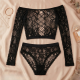 Дизайнът смесва класическа женственост с модерен сексапил: раменете са открити за деликатна деколте линия, предната и задната централна плетка придава драматичен акцент, а дългите ръкави балансират откритите участъци за хармоничен силует. Черният цвят усилва усещането за лукс и драматичност, докато флоралните мотиви създават текстурен контраст, който се вижда и усеща. Този комплект допълва стила, като подчертава увереността — носете го за интимни моменти или като част от моден ансамбъл за вечерно събитие, комбинирайки с висок талок или ефектен халат.