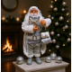 Елегантен сребрист Дядо Коледа с дълго палто, пухкави кантове и детайлно изработени аксесоари. Комбинацията от бяло и металик сребро създава усещане за лукс и зимна приказка. В ръцете му има миниатюрни подаръци и зеленина – символ на изобилие и празничност.