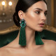 Дизайнът е вдъхновен от тропическата свежест и блясъка на вечерните коктейли. Централният кристал е разположен върху деликатна метална основа, обрамчен от по-малки кристалчета и декоративни елементи, напомнящи венец от листа. От него пада дълга ресничка с финна нишка, която при движение създава феерично усещане. Контрастът между твърдия блясък на кристалите и меката текстура на ресните изгражда модерен, но романтичен образ. Достойнството на модела е и в универсалността: жълтите обеци дават свежа и смела нотка, а зелените носят елегантна наситеност и дълбочина.
