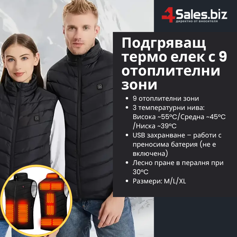 9 отоплителни зони – равномерно затоплят цялата горна част на тялото, включително гърба и корема. 3 нива на температура – избери между 39°C, 45°C и 55°C според времето и личния комфорт. USB захранване – работи с всяка външна батерия (Power Bank не е включен). Водоустойчив и ветроустойчив материал – запазва топлината дори при дъжд или силен вятър. Лесна поддръжка – може да се пере на ръка или в пералня (деликатен цикъл до 30°C).нТази жилетка е идеална за риболов, мотор, ски, туризъм, зимни разходки или просто за уют у дома. Без излишни слоеве дрехи – само истинска топлина, когато ти трябва.