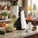 Модерен и практичен дизайн — комбинация от бял и черен корпус, която се вписва във всеки кухненски интериор. Компактните размери и стабилните гумени крачета осигуряват здраво сцепление върху плота, а разглобяемите части позволяват удобно съхранение. Прозрачният улеи за подаване дава гледка към процеса, а ергономичният потискач гарантира безопасно и лесно натискане на продуктите към острието. Всички барабани са от висококачествена неръждаема стомана, устойчиви на корозия и лесни за поддръжка.