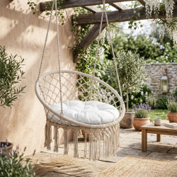 Хамака е практичен и удобен подходящ е за използване от няколко човека едновременно, като издържа тегло до 150 кг. Иновативен, голям и удобен стол-хамак е тук за да се радват на него цялото семейство, приятели и роднини които идват на гости в дома ни. Хамака може да постави на двора, верандата, дори и в собствения ви дом, благодарение на интерестаната си система за окачване. Снабден с въжета и подходяща пръчка, можете да погледнете в показаните снимки, които сме предложили за по-добро зрително наблюдение и персонализиран на идеите ви, по този начин хамака се стеснява и и осигурява стабилност и е по-лесен за закачане на стена. Освен този начин има и друга възможност: Можете да го закачите като стандартен хамак - от двете му страни. Комплектът включва в себе си хамак, въжета и пръчка, които са стабилни, здрави и понасят голямо натоварване. Хамака е подходящ за подарък за всеки един повод, може да се впише във всеки дом.