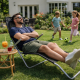 Този модел няма функция за накланяне, но поставката за крака и ергономичният дизайн осигуряват отличен комфорт за почивка и релакс на открито.