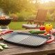 Правоъгълна, с леко заоблени ъгли и повдигнат борд за контрол на соковете. Стилното тъмно покритие със ситни „каменни“ пръски изглежда модерно и прикрива следи от употреба. Отдясно има ясно изразени оребрени канали, които отвеждат мазнината и оформят апетитни линии, а отляво – равна гладка зона за деликатни продукти. Двете яркочервени силиконови дръжки са не само удобни и топлоустойчиви, но и дават приятен акцент, който се откроява на плота и до барбекюто.