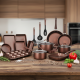 Комплектът включва: тенджера 16x8 см с капак (1,6 л); тенджера 20x9 см с капак (2,8 л); тенджера 24x12 см с капак (5,4 л); тиган 20x4 см; тиган 26x4,8 см; тиган 30x5 см; квадратен тиган 24x24x4,3 см; 3 бр. найлонови кухненски инструменти; 6 тави (мъфини 15,35x11,02x1,57 см; форма за кекс 9,09x5,04x2,72 см; кръгла тава 8,54x1,97 см; тави 13,38x9,64x2,16 см и 13,38x9,64x1,38 см); цедка. Тези размери и комплектовка са идеални за семейни готвения и разнообразни рецепти.