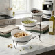 Дизайнът акцентира върху минимализъм и функционалност. Белите купи имат меки извивки и леко издължена форма, която придава модерна динамика. Металната стойка с черно покритие контрастира елегантно с керамичната повърхност, правейки комплекта подходящ за съвременни интериори и класически трапези. Разположението на купите на три нива осигурява визуална дълбочина и лесно обслужване, а крачетата на стойката добавят стабилност, без да отнемат от изяществото на продукта. Този дизайн цели да впечатли гости и да улесни домакина при поднасяне и подредба.