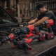 Дизайнът е агресивен, ергономичен и функционален — червено-черно оформление, което вдъхва увереност и професионализъм. Инструментите разполагат с гумени, неплъзгащи се ръкохватки за стабилен захват и контрол дори при влажни условия. Ъглошлайфът има допълнителна странична ръкохватка за по-добро управление при рязане и шлифоване. Гайковертът е компактен, но с алуминиева предна част за по-добро охлаждане и баланс; перфораторът е лек и удобен за работа в тесни пространства. Всички инструменти са оформени така, че да осигуряват лесна смяна на приставки и бърз достъп до батерията.