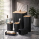 Комплектът е с изчистен, модерен дизайн в тъмен цвят с естествен акцент, който придава стил и топлина на банята. Формите са стабилни и удобни за употреба, без остри ръбове. Всеки елемент стои стабилно на мястото си и допринася за подреден и елегантен вид. Подходящ е както за класически, така и за модерни интериори.