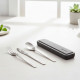 Кутийката е компактна, стилна и в приятен тъмносив цвят. Влиза във всяка чанта, без да заема място, и изглежда модерно, без излишни форми и декорации. Приборите имат изчистени линии и матов метален финиш – стоят елегантно и са удобни за хващане. Няма ръбове, няма хлъзгане, няма усещане за „евтино“. Просто практичен минимализъм, който пасва на всеки – от ученици, до работещи жени, домакини и хора, които обичат да са организирани.