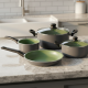 Комплектът съдържа 6 части: две тенджери (20 см и 24 см), касерола (16 см) и тиган (24 см), всички с модерно покритие и специални капаци. Външната част е в елегантен сив цвят, а вътрешната част в зеленото покритие придава свежест и стил. Незалепващото Pfluon покритие осигурява лесно готвене с минимално количество мазнина и без да се притеснявате за залепване на храната. А благодарение на турбо индукционната съвместимост, ще спестите енергия и време за приготвяне на ястия.