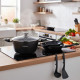 - Комбинация от тенджера и два тигана → покрива ежедневните нужди → от супи и сосове до пържене и запичане.
