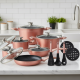 Елегантната розово-куперова фасада придава модерен и стилен акцент на всяка кухня. Вътрешното мраморно покритие освен функционално изглежда изключително привлекателно и задържа свежия вид на съдовете по-дълго. Комплектът е проектиран с внимание към детайла: здрави капаци с метален обков, добре балансирани дръжки и плътни ръбове за лесно сервиране. Тази комбинация от форма и функция превръща EDENBERG EB-5625 в чудесен избор за домакините, които искат и красота, и удобство.