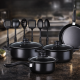 Класически черен цвят, който се вписва перфектно във всяка кухня. Лъскавата външност и практичният, но елегантен дизайн допринасят за модерното излъчване. Комплектът съчетава естетика и удобство, като предлага здравина и стил. С този комплект ще разполагате с всичко необходимо за готвене – от закуска до вечеря. Лесен за поддръжка и дълготраен, той е вашият перфектен помощник в кухнята!а