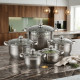 Дизайнът е едновременно класически и съвременен — полиран корпус от неръждаема стомана с деликатна матова лента, удобни дръжки за сигурен захват и сребристи капачета, които придават стил на кухненския интериор. Всеки съд е балансиран по размер и форма, за да се подрежда лесно в кухненските шкафове и да изглежда хармонично на плота. Подходящ за традиционни и модерни кухни, комплектът създава усещане за професионална мисъл зад всеки детайл, като в същото време остава топъл и приятелски към домакините.