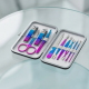 Този комплект впечатлява с няколко отличителни характеристики, които го правят предпочитан избор сред жените, които държат на стил и функционалност. Инструментите са с устойчиво покритие в синьо-виолетово омбре, което добавя модерен акцент към всяка чантичка и се вписва перфектно в колекцията ви от модни аксесоари. Калъфът с матово покритие осигурява здраво, но меко докосване и лесен достъп благодарение на интуитивния механизъм за отваряне. Лек и компактен, комплектът е идеален за пътуване и ежедневна употреба, като същевременно поддържа професионално качество за домашен маникюр и грижа за ноктите.