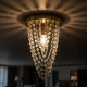 - Силна визуална сцена от тавана – фасетираните вериги от прозрачни „кристали“ разпръскват светлината в красиви шарки (виж ефекта на снимката в интериор), така че получаваш едновременно акцент и приятна атмосферна светлина.