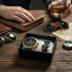 Корпусът е масивен и изразителен – тип XL, с релефен безел и минутна скала 10–60, които придават динамика. Черният циферблат създава дълбочина, а златистите стрелки и индекси дават отлична четимост с един поглед. Каишката е черна, със семпла прошивка, което подсилва усещането за спорт-елегант. Гривната е плетена, с регулируем възел за различни китки; металният елемент е в „старо злато“, хармониращ с корпуса на часовника. В луксозната кутия часовникът е поставен върху възглавничка – изглежда представително още при отваряне.