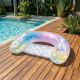 Красив, игрив и функционален дизайн. Формата напомня арка, която поддържа гръб и позволява релаксиращо полулегнало положение. Цветовете са меки, дъгообразни и осигуряват фото-готов вид за всяка лятна снимка. Белите силуети на русалки и блестящите частици в материала добавят приказен акцент. Двете поставки за чаши са разположени симетрично в предната част за лесен достъп. Внимателната конструкция балансира стабилност и комфорт — не се люлее прекалено и държи тялото в удобно положение, докато се наслаждаваш на слънцето и водата.
