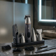 Дизайнът е модерно балансиран между ергономия и стил — устройството пасва отлично в ръката, с метални елементи и премерен тъмен корпус за професионален вид. Зарядната станция служи като организатор, който държи всички приставки на място и изглежда престижно в банята. LCD дисплеят е интуитивен и дава ясна информация, а дългият USB кабел осигурява свобода при зареждане. Формата и материалите вдъхват доверие и предлагат дълготрайна здравина при ежедневна употреба.