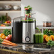 Дизайнът е създаден за модерна кухня: елегантна комбинация от неръждаема стомана и тъмен полимер за минималистичен, но силно функционален вид. Компактните размери 31x18x29 см позволяват поставяне на плота без да заемат излишно място. Чашата за сок от 0.5 л е прозрачен и удобен контейнер, а контейнерът за отпадъци е с достатъчен обем за няколко цикъла на изцеждане. Управлението е интуитивно чрез въртящ бутон, а металният лост за заключване осигурява сигурност и стабилност при работа.
