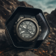 Моделът е смело спортен – тъмен циферблат с метален безел и четири функционални бутона за бърза работа. Изпъкналите винтове и матовият финиш придават „тактически“ характер, който стои еднакво добре с екип за тренировка и с ежедневни дрехи. Широката каишка е черна, мека и приятна на китката, а големите цифри и стрелки създават усещане за мощ и надеждност. Шестоъгълната кутия подсилва усещането за премиум подарък и пази часовника безопасно.