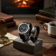 Geduo залага на чист, мъжки силует. Сребристият корпус с полирани елементи обрамчва черния текстуриран циферблат, а минималните индексни маркери поддържат визията подредена и модерна. Големите цифри 12 и 3 придават динамика и правят часовника разпознаваем. Гривната комбинира кожа и плетка от връв с метални акценти; релефната лъвска глава е дискретен, но запомнящ се детайл. Всичко е подредено в черна кутия с бяла възглавничка – изглежда стойностно още при отварянето.