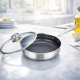 Елегантен и професионален вид, създаден за дома: Външният корпус е от фина неръждаема стомана с полирано покритие, което допълва модерната кухня и прави тигана подходящ както за всекидневна употреба, така и за специални поводи. Вътрешната повърхност с пчелна пита не само подсилва незалепващия слой, но и придава изтънчен индустриален вид. Ергономичната дръжка е здраво прикована и удобна за захват, а прозрачният капак с метална дръжка ви позволява да следите готвенето без да губите топлина и влага.